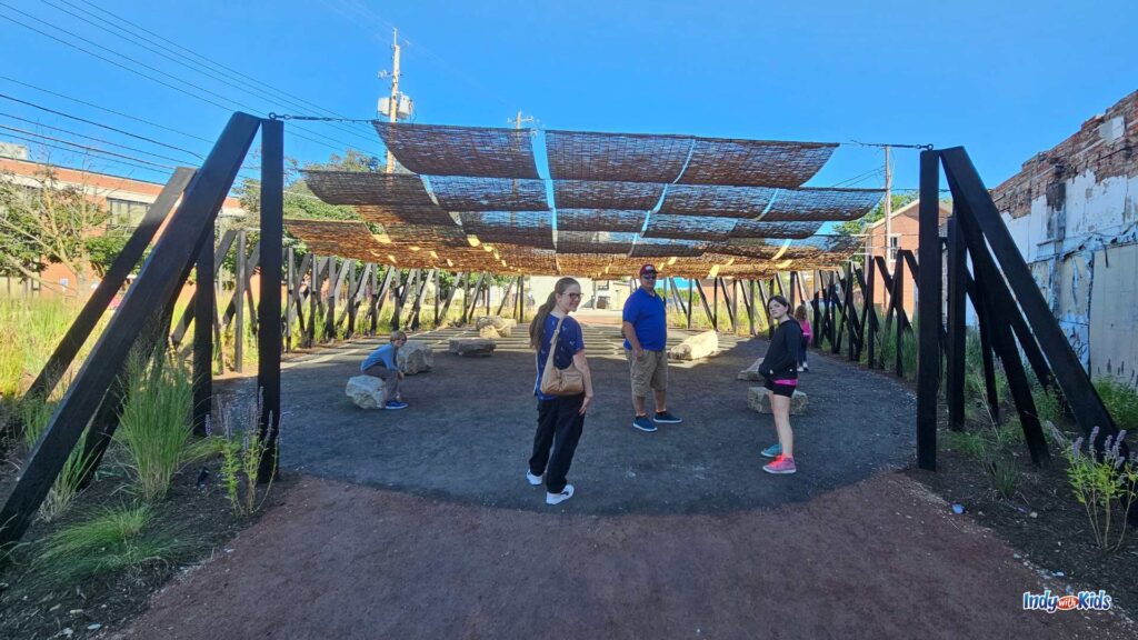 One of the most thought-provoking installations at Exhibit Columbus 2025 is Ellipsis, located on the site of the former Irwin Block building that burned down in 2022. Rather than seeing the empty lot as a loss, the designers reimagined it as a place for reflection, storytelling, and gathering. The installation uses a circular earthwork and prairie mound, with a fire-treated timber canopy hovering above. It honors both Black and Indigenous histories in Indiana, while also making space for imagining new futures. Families visiting will notice how the design feels open and unfinished, like an ellipsis (…) at the end of a sentence—inviting everyone to pause and consider what comes next.