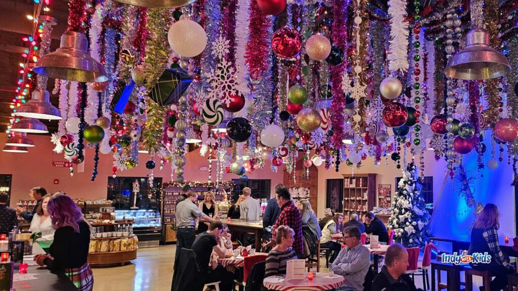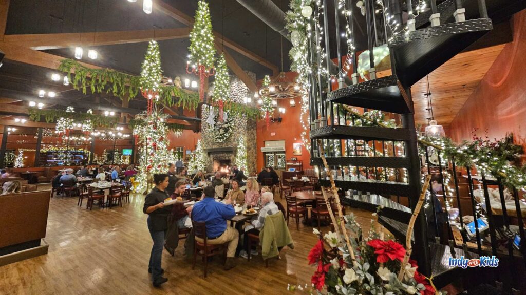 The Farmhouse Restaurant at Fair Oaks Farms is stunning during the holiday season. Twinkling lights, a lit fireplace, a large Christmas tree, and a full dining room decked out in festive décor make it feel incredibly warm and welcoming. If you’re looking for a holiday meal that feels special without being formal or fussy, this is a great option for families and multigenerational groups.
